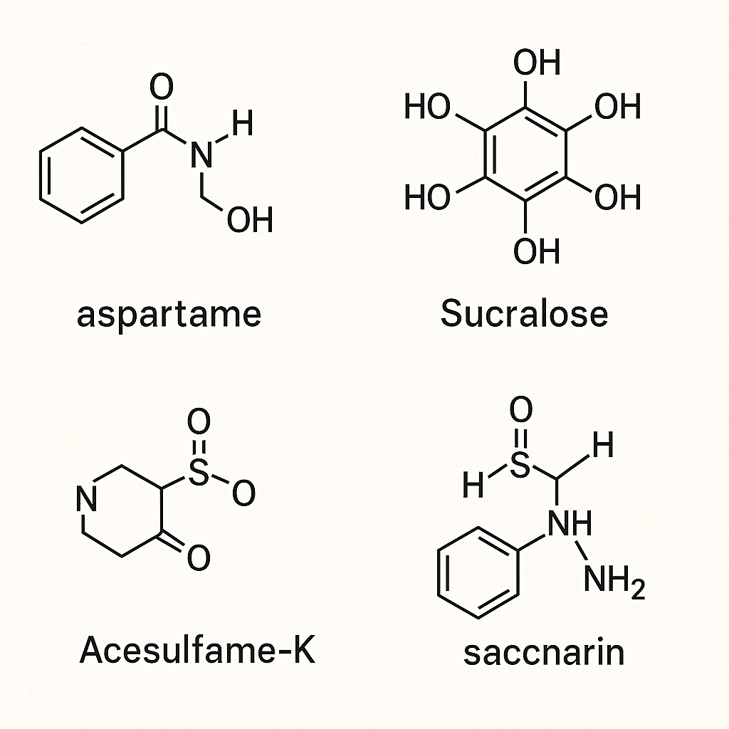 Aspartam, Sukraloz, Acesulfam-K, Sakarin gibi tatlandırıcılar laboratuvar ortamında sentezlenen ve tatlılık hissi veren bileşiklerdir. Kalori içermezler, ancak çok daha yoğun tat verirler (bazıları şekere göre 200-600 kat daha tatlıdır!).